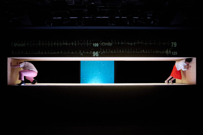Alle fünf Schauspielenden sind mit EKG-Elektroden verkabelt, die Herzfrequenz und Rhythmusstörungen werden stets oberhalb der Holzkonstruktion angezeigt. Als Zuschauer*in verfolgt man, wie der Verlauf ausschlägt, wenn der Druck steigt. Der Druck, der nie abnimmt, der von allen Seiten kommt und der krank machen kann, wenn er zu stark ansteigt, wenn die Belastungen zu groß werden: Broken Heart Syndrome. Der Monolog Hassans wurde für die Nürnberger Fassung von Dabiri zusätzlich geschrieben und verleiht dem Stück eine literarische Ebene, die sich hervorhebt.