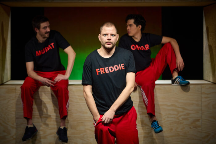 Das Bühnenbild (Ariane Salzbrunn) setzt sich aus zwei großen Holzquadern, die sich über die Länge der Bühne strecken, zusammen. In deren Mitte befinden sich an den Enden jeweils zwei kürzere Holzblöcke, sodass dazwischen ein Leerraum entsteht. In dieser Lücke sitzen die drei Jungs auf dem untersten Quader wie auf einer Mauer, lassen die Beine baumeln. Das Gespräch, das mit der Verhaftung ihres Freundes beginnt, zieht schnell weitere Kreise und verhandelt im dichten Schlagabtausch Religion, Identität, Rassismus, Klassismus und Erwartungshaltungen seitens der Familie sowie der Gesellschaft.