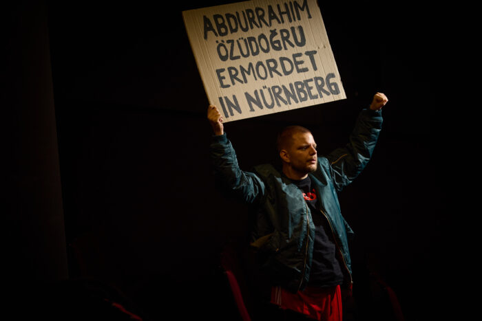 Murat, Omar und Freddie wollen den Druck entladen und nicht selbst daran kaputt gehen. Als die Urteilsverkündung drei Jahre für ihren Freund festlegt, kommt es zur Demonstration, die aufgrund von rechtsradikalen, identitären Gegenprotesten eskaliert. Das Bühnenbild verwandelt sich, filmische Sequenzen von Demos und Polizeiaufgeboten werden an die Holzwände projiziert, die Musik schwillt an, die Schauspielenden stehen mit Schildern – ein erneuter Verweis auf Nürnberg – im Zuschauendenraum und schreien Parolen. Die bedrohliche Stimmung ist greifbar, das Licht im Saal geht an, niemand kann sich dem Geschehen entziehen, Aufmerksamkeit wird unweigerlich generiert. Dennoch kann sich das Publikum nach 90 Minuten zurückziehen – für manche ist dieser Druck jedoch Realität, aus der es keinen Rückzug gibt. Dieses Anprangern gelingt durch den dramaturgischen (Dramaturgie: Paul Berg) Höhepunkt des Stücks sehr wirkungsvoll.