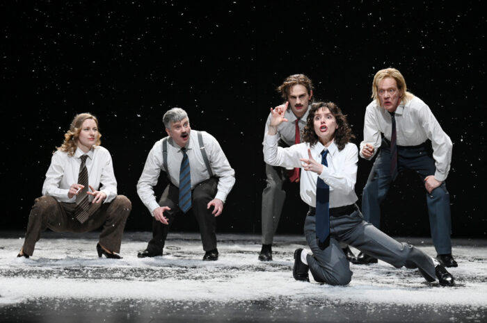 Baudy und Köhler greifen mit Brauner Schnee über Franken den Doppelmord an Lewin und Poeschke auf, der 1980 Erlangen ebenso sehr erschütterte wie er in der Öffentlichkeit auch schnell wieder verblasste. Durch die vielschichtige Gestaltung schaffen die beiden dabei den Balanceakt zwischen humorvoller und zugänglicher Unterhaltung sowie bitterem Ernst. Die Schauspieler*innen stellen Szenarien von damals dar, wenden sich allerdings auch informierend, nahezu dokumentativ ans Publikum, um bestimmte Sachverhalte zu veranschaulichen. Bissig-karikierend performen Kai Götting, Hermann Große-Berg, Ralph Jung, Clara Liepsch und Hannah Weiss als Medienvertreter*innen, die um die reißerischsten Schlagzeilen ringen oder geben als Mitglieder der Wehrsportgruppe Hoffmann einen Einblick in den Übungsalltag des Marschierens und Schießens in thüringischen Wäldern, während sie immer wieder betonen, dass sie ja auf gar keinen Fall politisch seien. Aber auch Shlomo Lewin wird zitiert, als Teile seiner Rede wiedergegeben werden, die er 1977 anlässlich der Kundgebung zum sogenannten Auschwitz-Kongress in Nürnberg hielt. Worte, die erschreckend zutreffend auch ins Jahr 2026 passen.